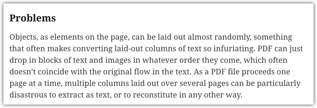 • Z PDF může být obtížné dostat ven v použitelné podobě obrázky, ale hlavně jakékoliv informace, které si PDF převedlo z původní použitelné podoby do vlastní nepoužitelné (ale snadno zobrazitelné).